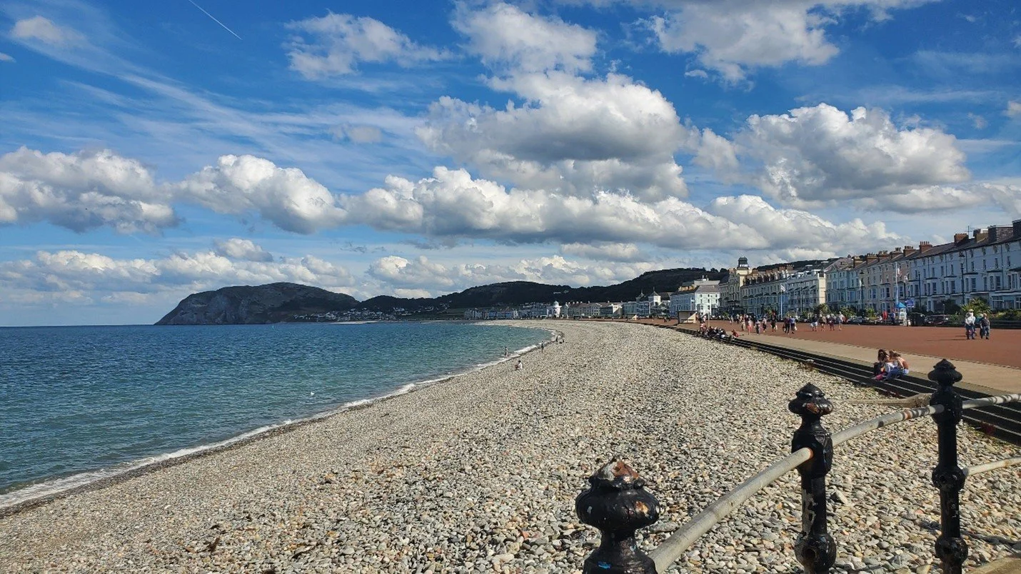 The stony beach of Llandudno with the white Victorian houses near the promenade