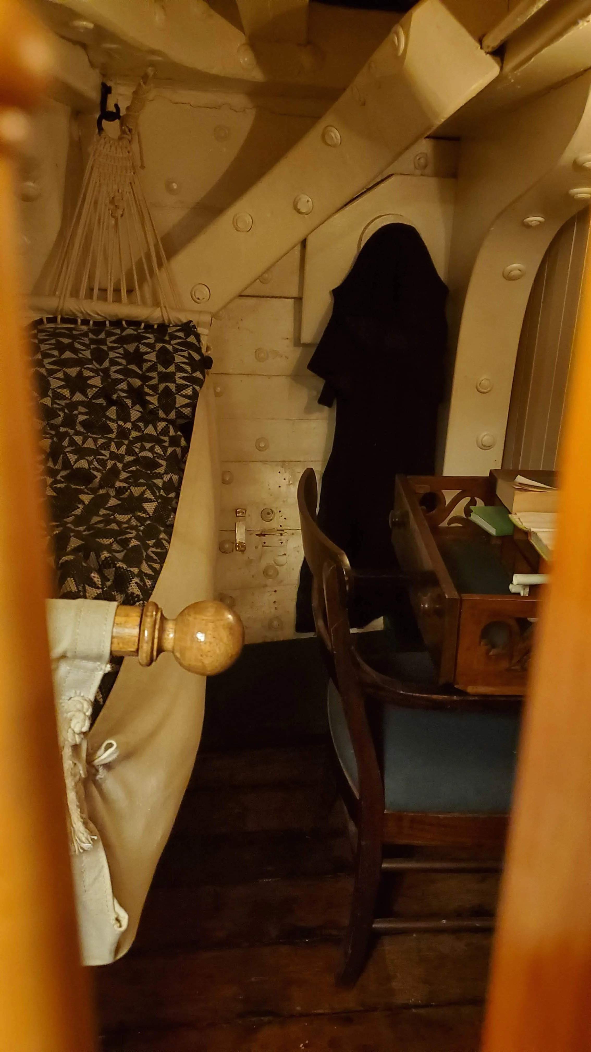 Right: A picture inside one of the officer’s quarters. They only had their hammock and a tiny desk, but this was still much more room than a common crewman had.