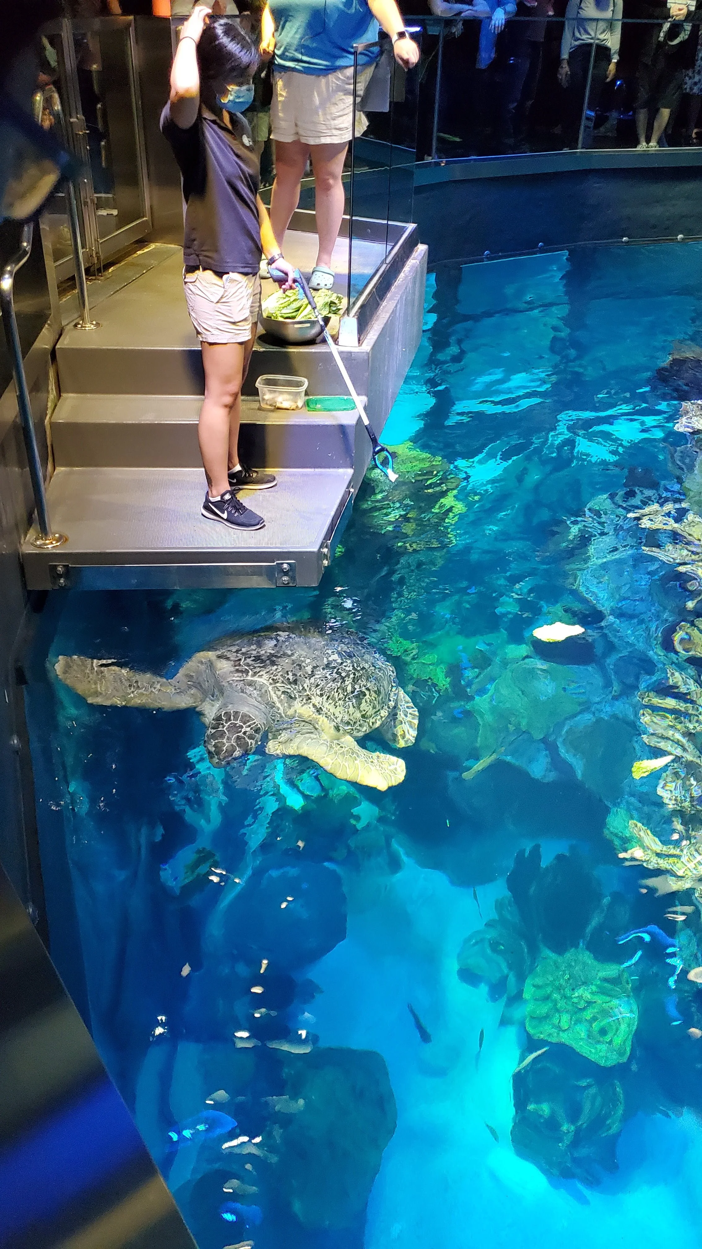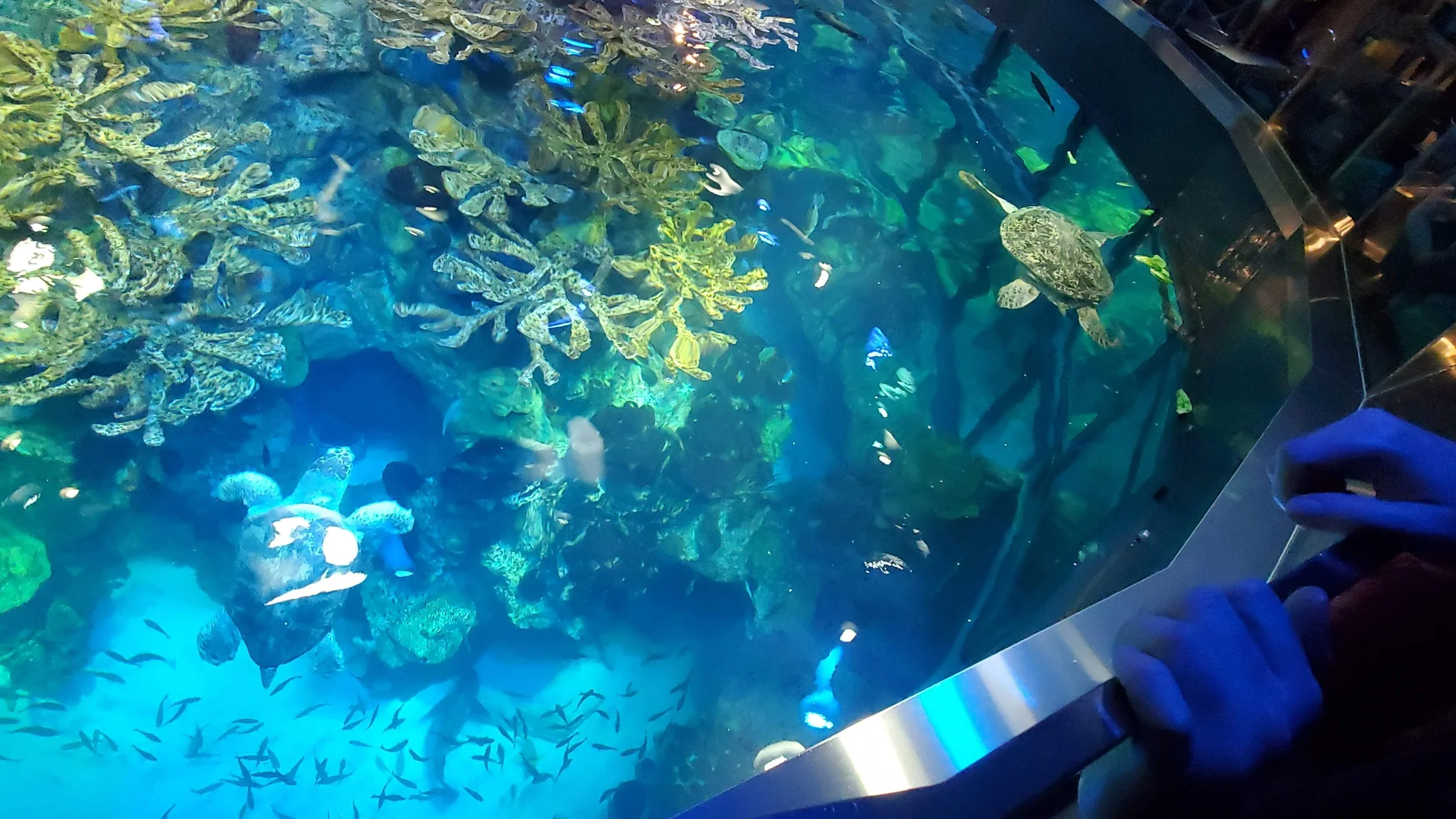 Our second day (as the name suggests) was all about Boston. We packed our things and left the Airbnb. Because driving in Boston is never recommended, we went to a park and ride and took the train in. I could not find the exact park and ride we used but there are many options around Boston, just be sure you use one with a good rating. I remember liking the look of the train station and it had a cool bridge over to the train tracks. The first thing we did was make a beeline for the Boston Aquarium. This place gets very busy, especially on weekends, because it's so impressive. The main room has a massive tank with huge turtles and a spiral walkway to travel up and see the sea life. The big turtle on top of the tank.