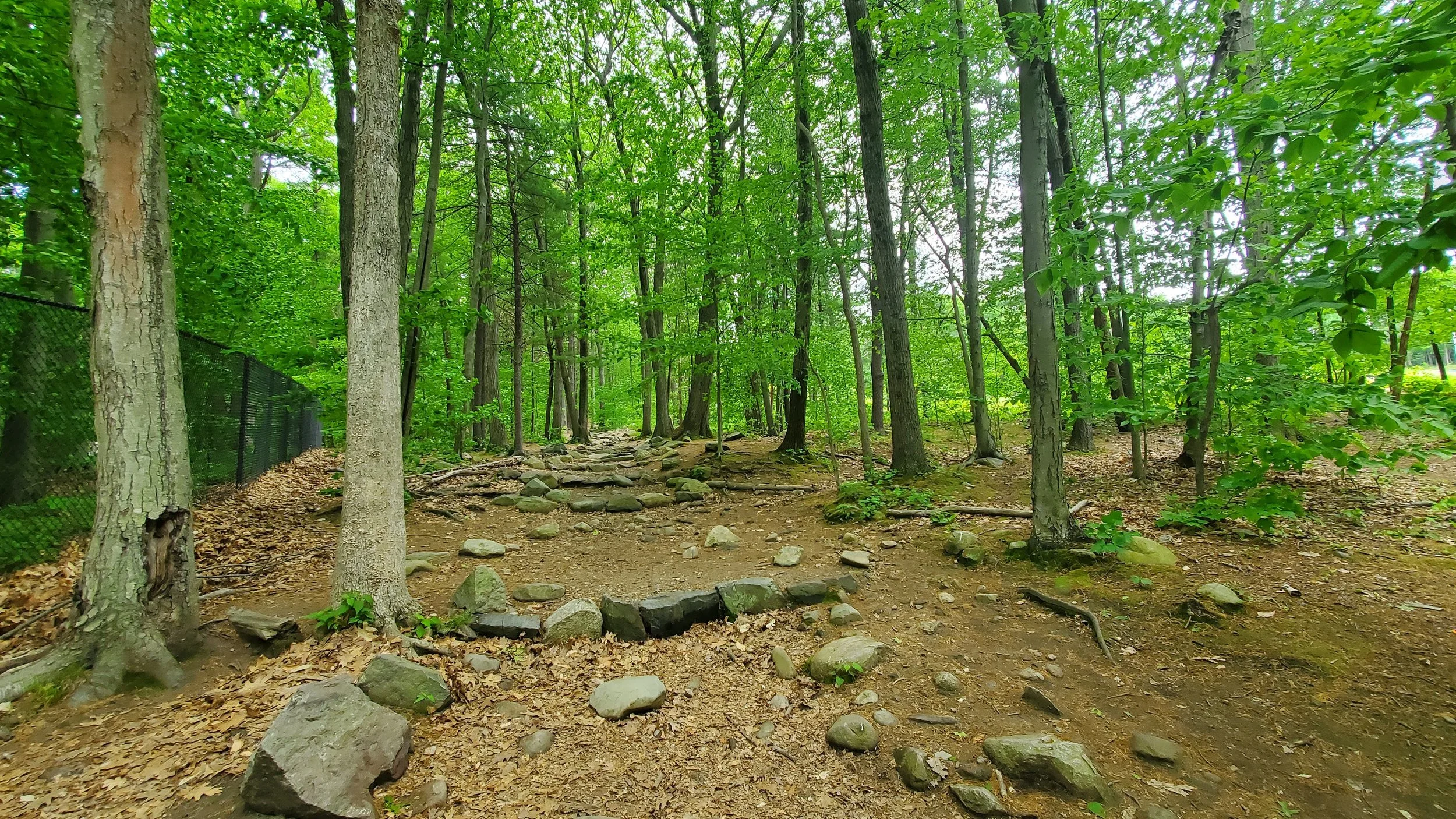 Rocky hills near the cages. There are small rocky steps into the trail.
