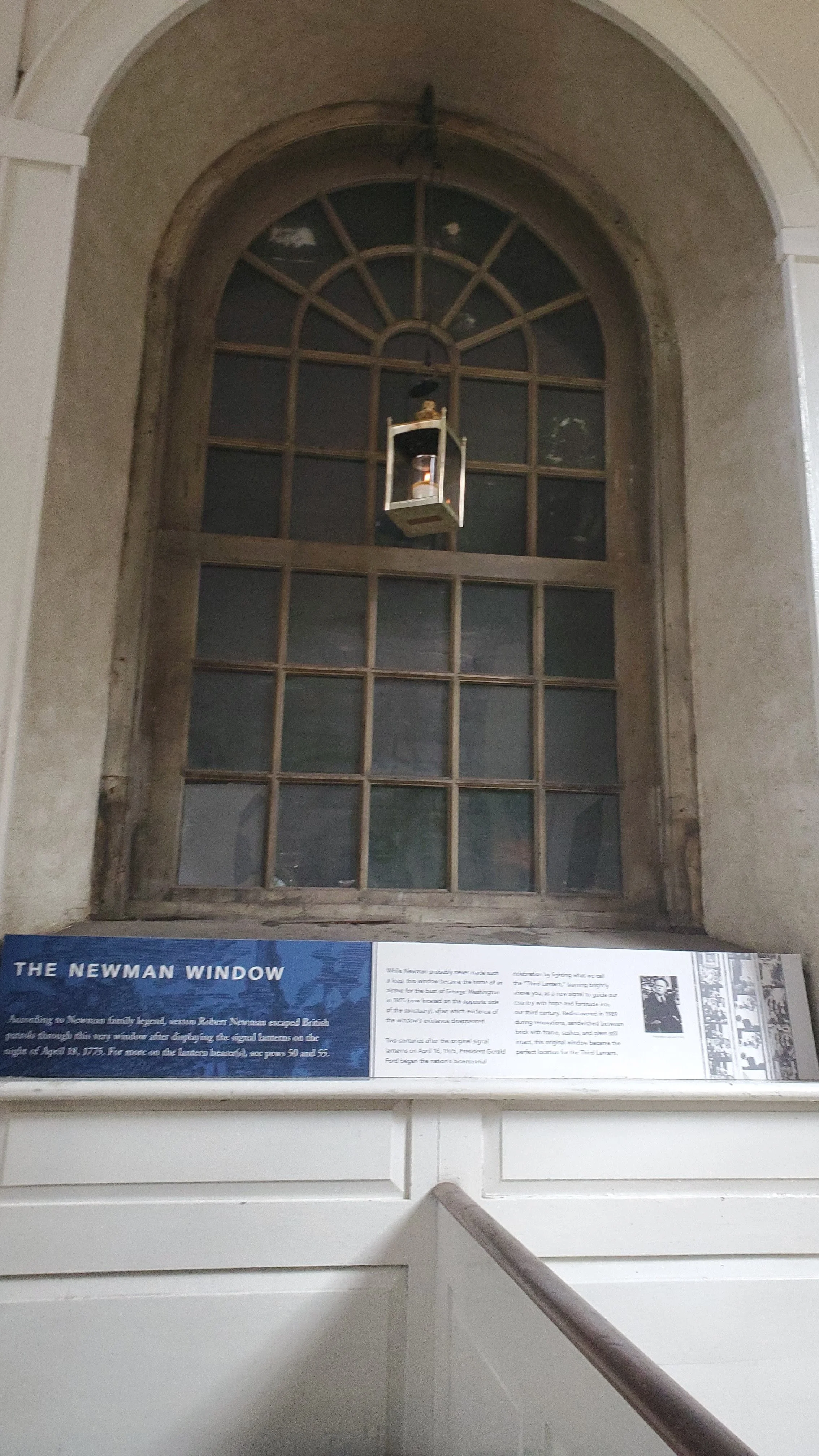 This is the Newman window. The sexton of the church Robert Newman was said to have jumped out this window to avoid being caught by the British after handing the signal lanterns. I imagine his epic jump through this window was similar to action movies where all the glass shattered epically.