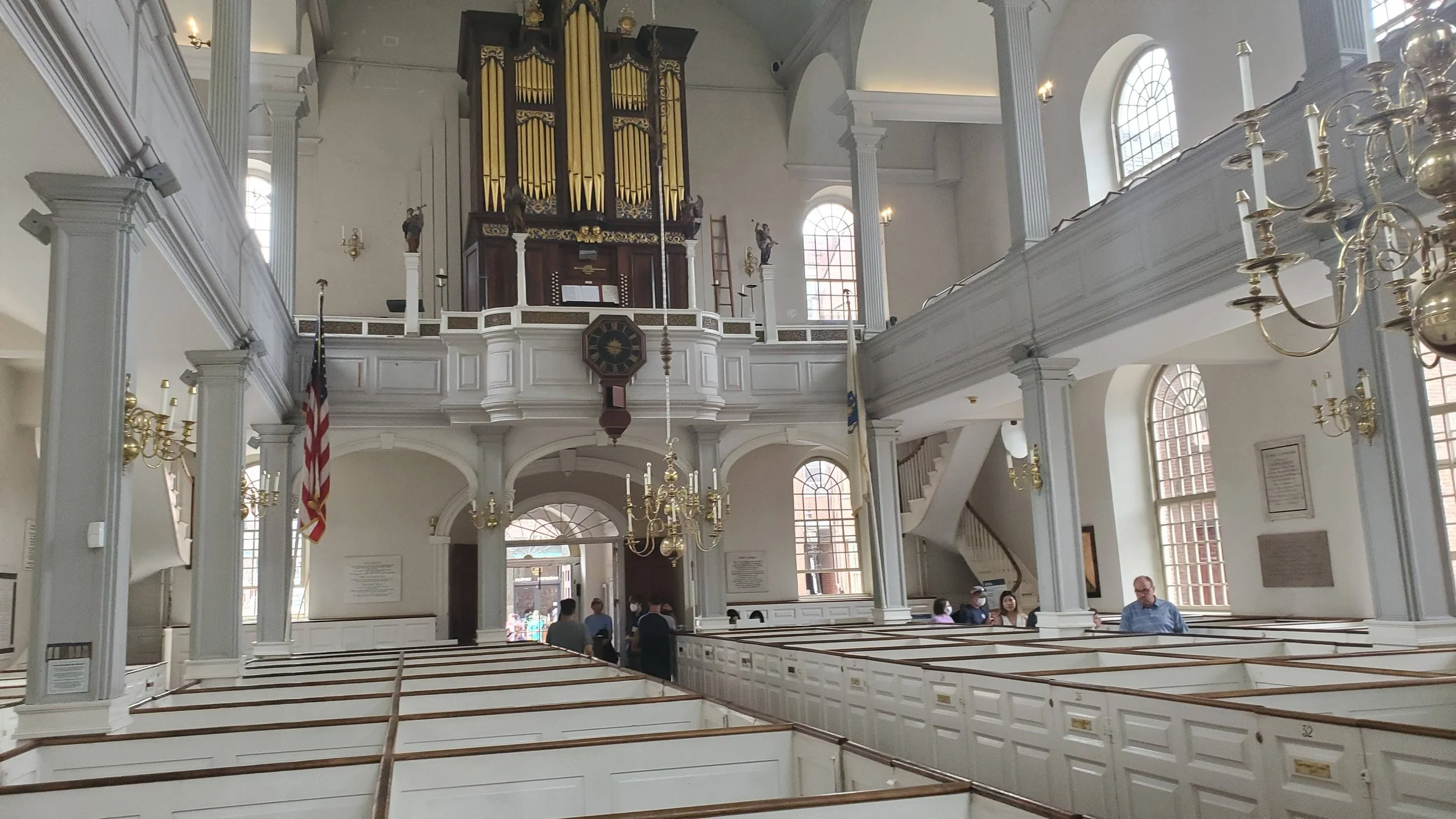 Beautiful Georgian interior of the church. Many 18th century churches in America (and New England particularly) look like this one. Families all had separate pew boxes. The richer families had larger and nicer boxes.