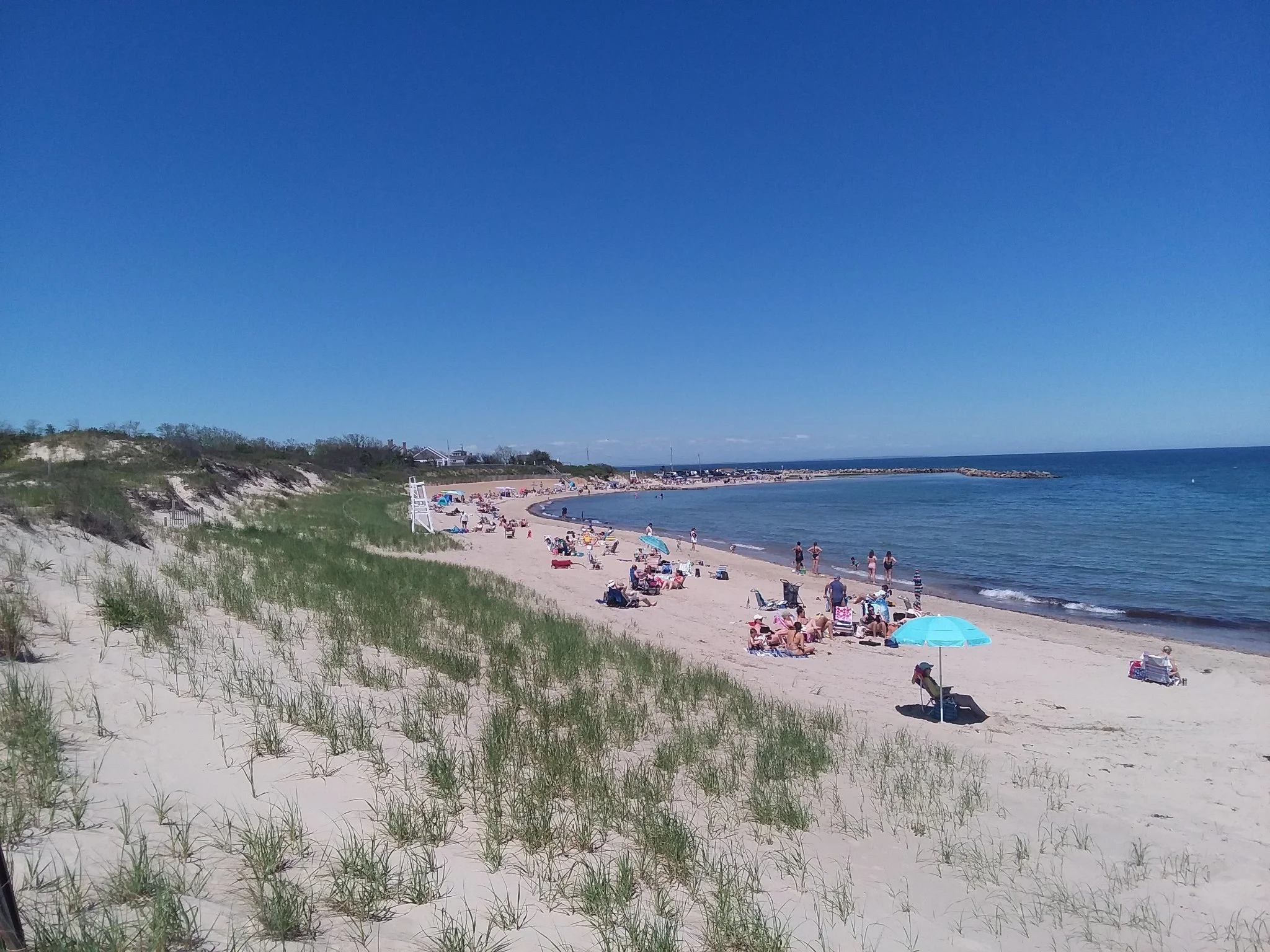 We arrived at our new Airbnb in Cape Cod after Boston. It was a cool downstairs area of a larger house. It has a separate entrance and was much more secluded than the first Airbnb. We dedicated most of day 3 to relaxing on a beach as this is what Cape Cod is known for. We went to Corporation Beach as it was recommended by our Airbnb host. The beach has everything you need, toilets, snack bar parking. It is a little expensive (I think 25 dollars) to park for the day but we later returned here to watch the sunset, so we probably got our monies worth. We bought a large beach tent so I could enjoy the beach but not burn in the sun. Cerisa was not so lucky. She fell asleep and forgot to reapply sunscreen and got a really bad sunburn. Remember to reapply that sunscreen everyone. There were a few other little things we explored nearby after the beach day and waiting for the sunset. We saw a windmill from the 1790s in a tiny park, had dinner at Hyannis and went to a viewing tower before going back to the beach. You can tell the sunset was impressive since it was used for the cover photo for this page. Corporation Beach, day.