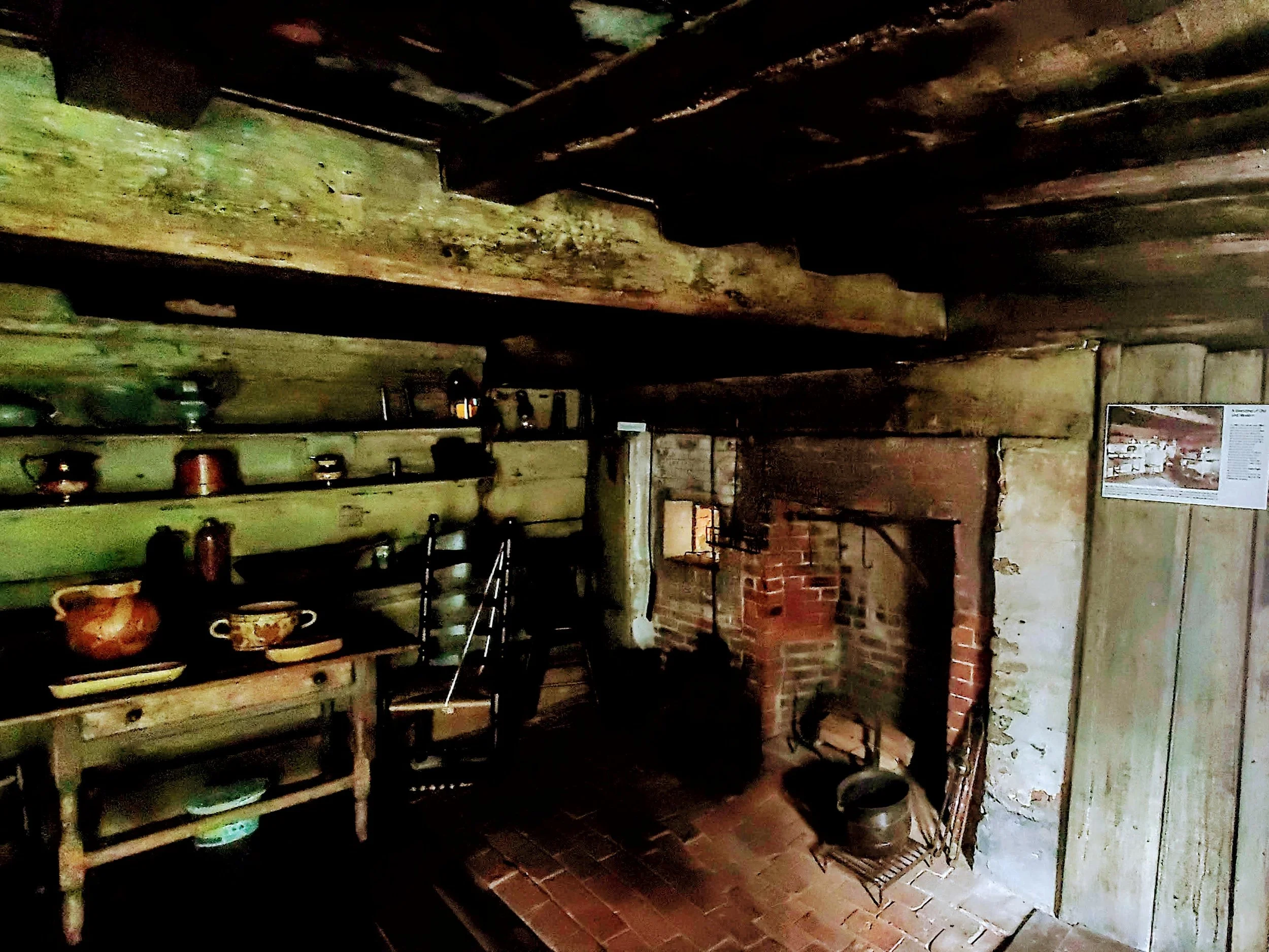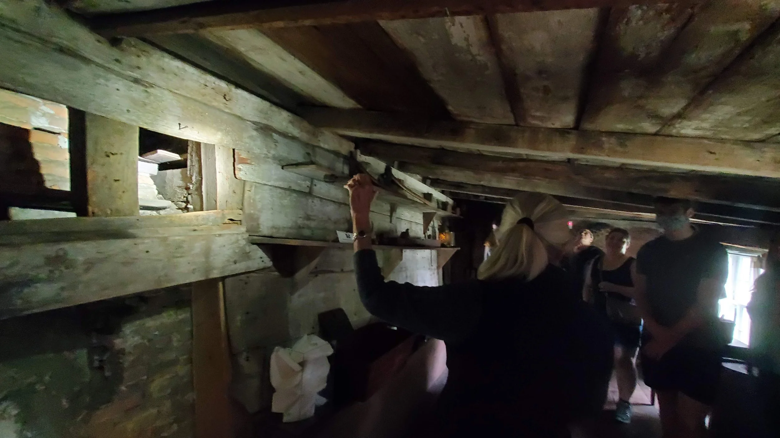 A brightened view of me in the oldest part of the house. You can see how large the summer beam is and how low the ceiling is. It was very dark in there and the tour guys had flashlights to point things out.