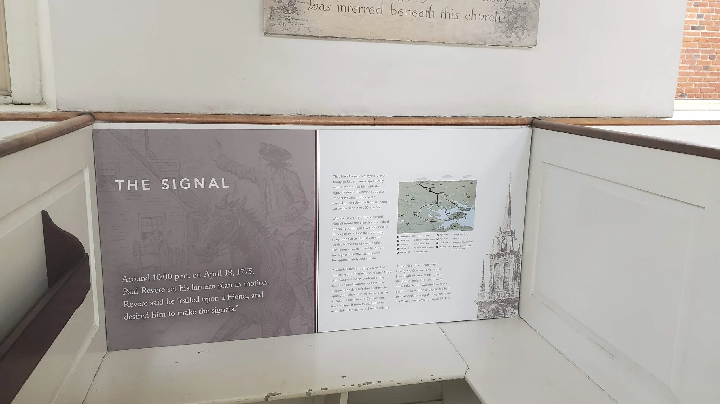A pew with a panel mentioning the famous signal and Revere’s ride.