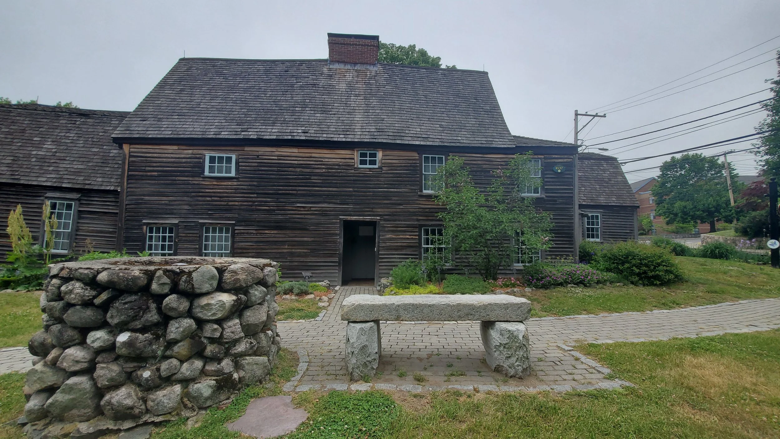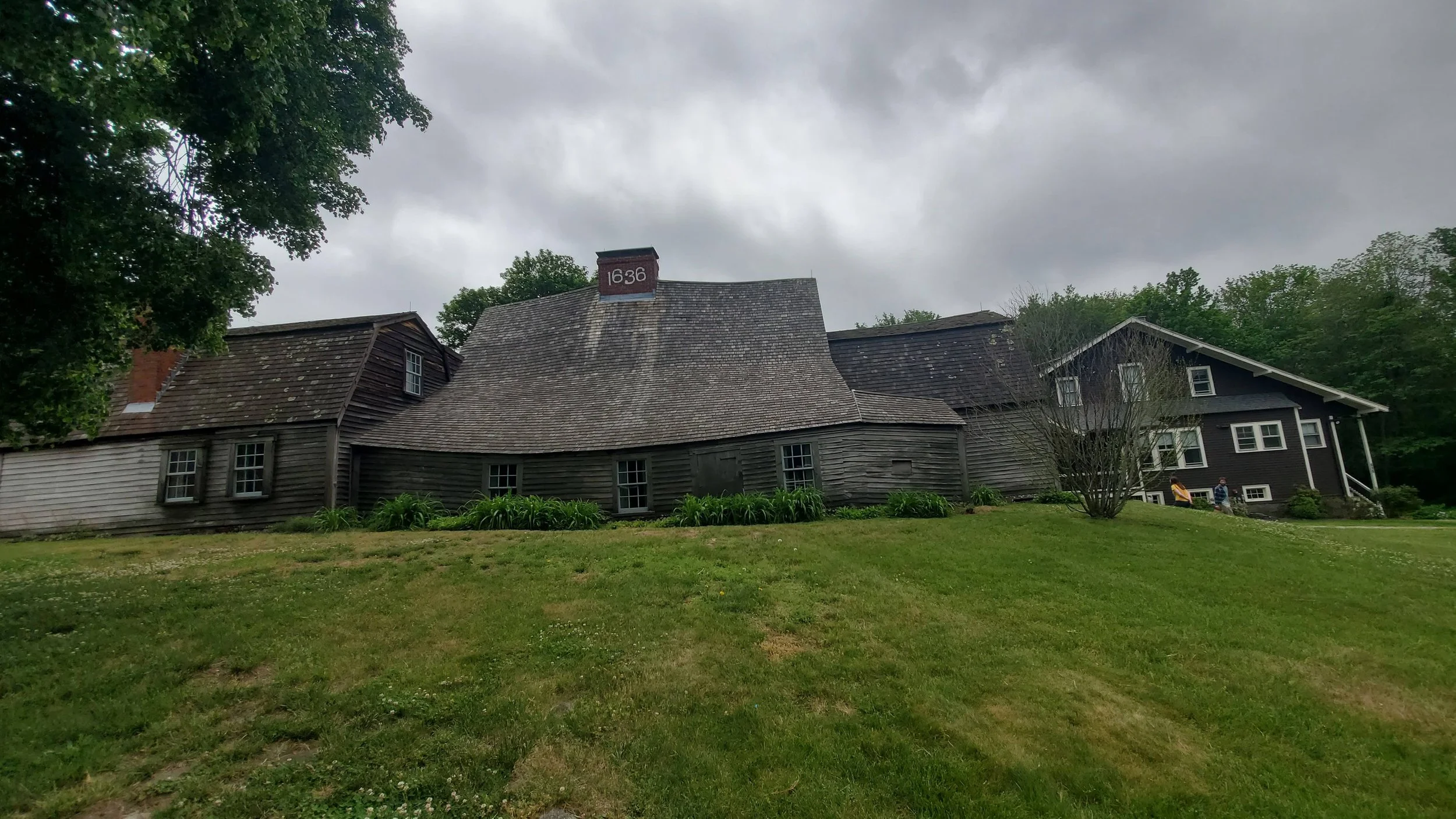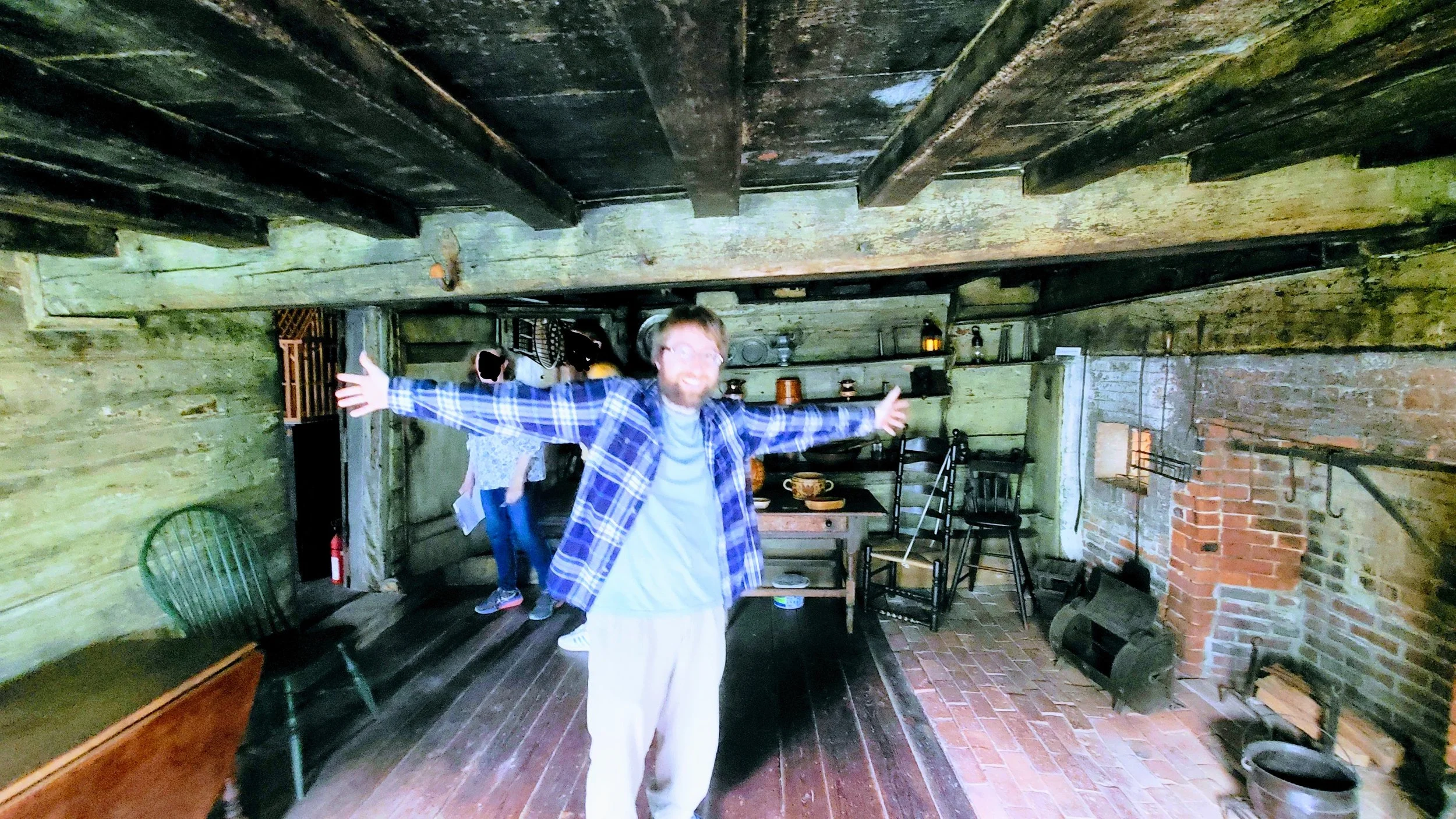 Highly recommend seeing the Fairbanks House if you are interested in old houses. The tour guides are great, you learn a lot. One of the coolest parts was the 'Hex Marks' carved around the chimney. I will talk more about that in the Folklore section. This house is so old that Massachusetts Bay Colony was still using armor and pikes in their militia along with old matchlock muskets. Also, it's over 50 years before the Salem Witch Trials and before the English Civil War of 1642. https://www.youtube.com/shorts/Tpw7hoWwBugShort video from the tour. It's a little hard to hear but you can see how dark it was in there. The tour guide explains tree ring dating. Cerisa took this picture of the back of the Fairbanks house, showing the steep sloping roof that the house is famous for as well. The tour guide told us the back slope might have originally been open to allow animals in and serve more as a porch.