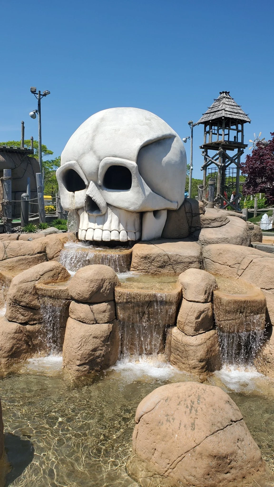 We had planned two beach days but Cerisa was too burnt to go back. She protested and said she would just lay on her stomach, but she relented and admitted that was probably not a good idea when she had trouble moving from the burns (she was fine in a few days). To our dismay, the Whydah Pirate Museum was closed on Sundays so that remains on our bucket list. Instead, we went to Sandwich MA. On the way to Sandwich we stopped at the Skull Island mini golf. We had driven past it between the beach and on our way back to our Airbnb and were impressed by the theming. I love a good themed anything and mini golf is a classic vacation activity. Left: The skull of skull island. The whole thing had a tropical jungle/island theme.