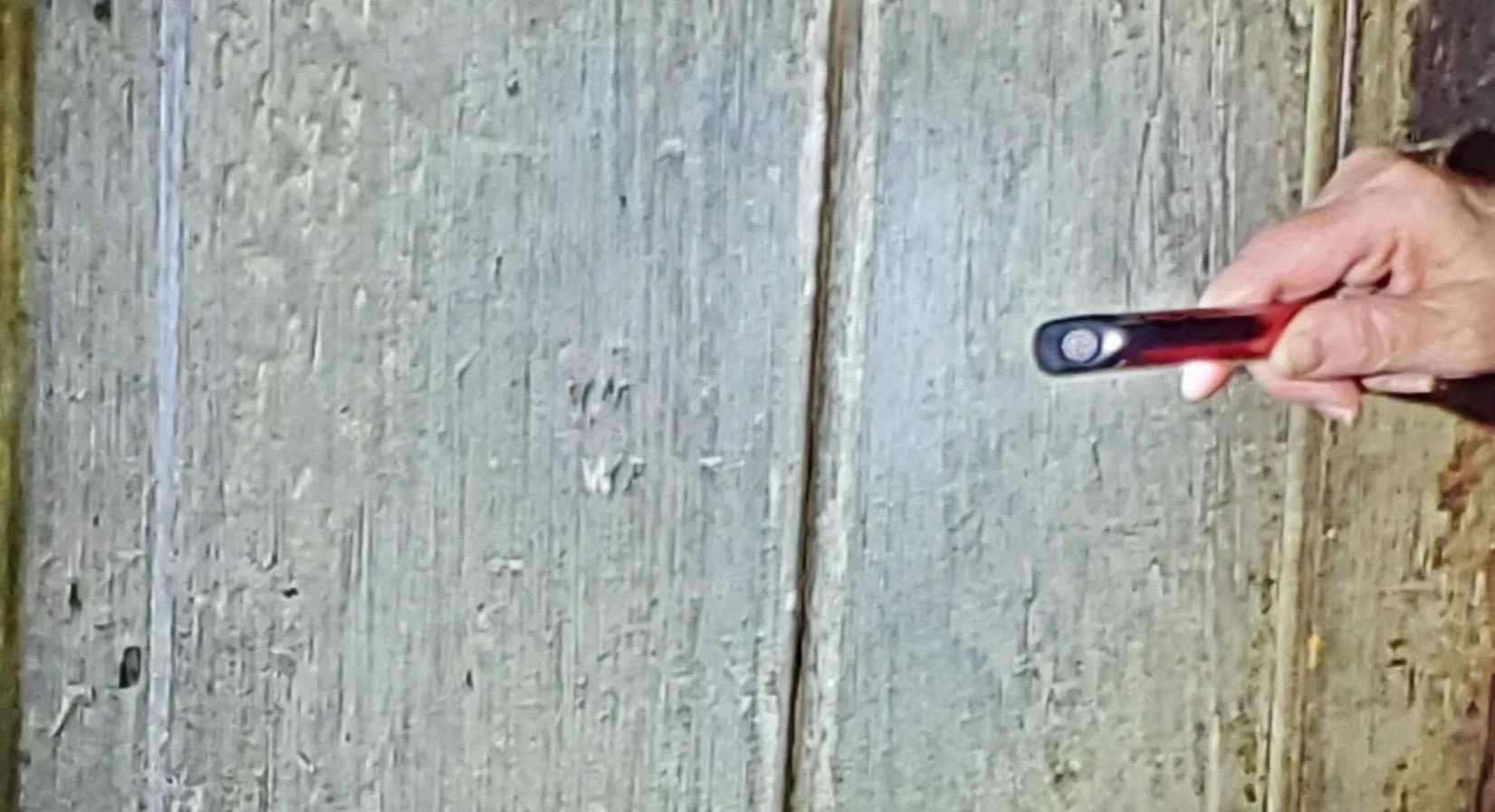 I am pointing to the black holes in the wood where they drilled to get the tree ring samples.